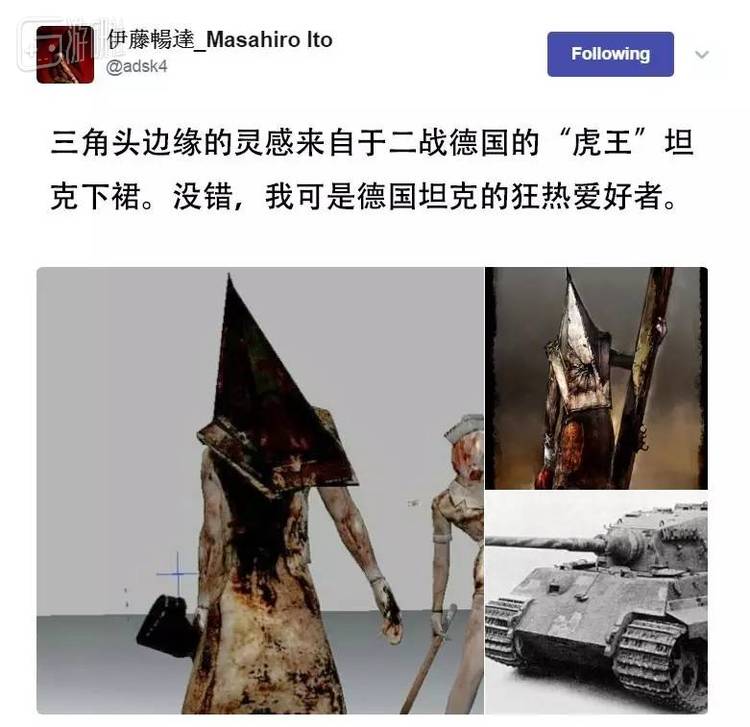 比如另一个2代的著名Boss级怪物,三角头,头部边缘形状的灵感其实是来自二战时期,常被俗称为“虎王”的德国“虎II”型坦克。伊藤自己是个狂热的二战德国军迷。