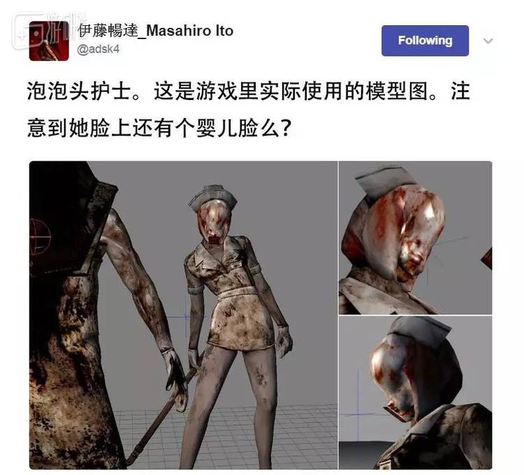 伊藤贴出了几张“泡泡头”护士的3D模型图,特别提醒人们注意她的面部细节,其实里面有张婴儿的脸。