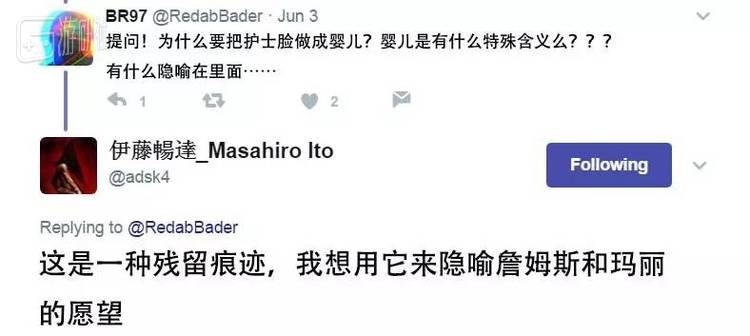 除此之外,护士嘴边凸起的红色方块,伊藤说是用来隐喻游戏里那个“9个红方块”的。