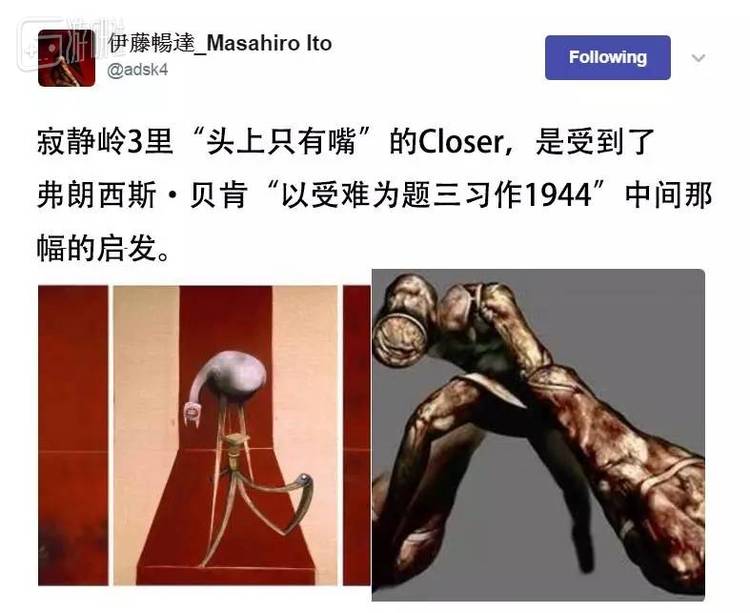 好比3代里外型明显参考女性,似乎又有点走下三路设计的Boss怪Closer,就是从英国艺术家弗朗西斯·贝肯的作品中借鉴而来。