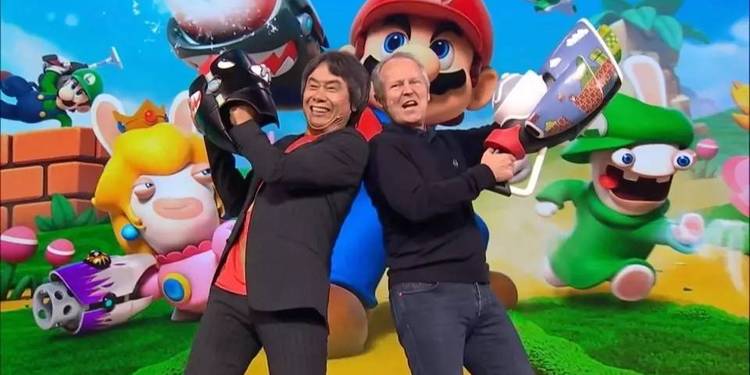 在发布会开场时,育碧就公布将与任天堂合作,把自己旗下的人气游戏角色,又贱又让人爱的角色疯兔,与宫本茂大师创作的马里奥结合到一起,打造出全新的一款战棋类策略游戏《马里奥 + 疯兔:王国大战》,并且请到了马里奥之父——宫本茂前来站台。