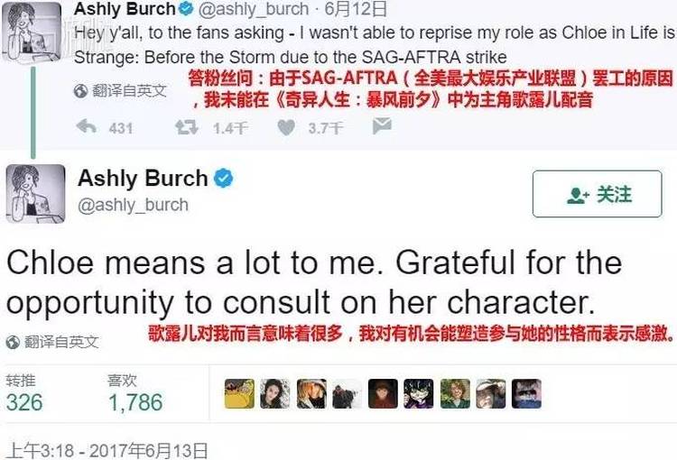 昨天,在前作中为Chloe担任配音的阿什莉·伯奇发Twitter称,由于参与去年10月SAG-AFTRA罢工的原因,自己并没有参与此次的配音工作。也就是说,续作的主角配音演员更换了,这件事情在Twitter上引发了网友热议。
