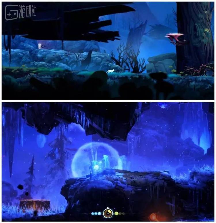 《Wenjia》的早期截图(上图)和《奥日与黑暗森林》(下图)的确有一些相似