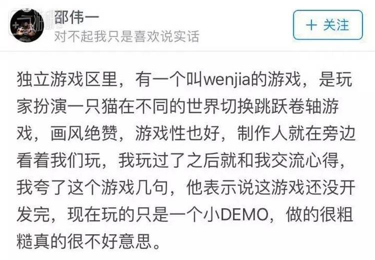此时Wenjia的开发还处于非常初期的阶段,整体进度不足10%,砍掉重练对工作室来说损失不大。谢斌说:“我们宁可游戏看起来简陋得可笑,也不愿意被挂上抄袭的名号。‘奥日’是我很喜欢的游戏,我们的游戏还远远达不到那个水平,何况也不是同类游戏。