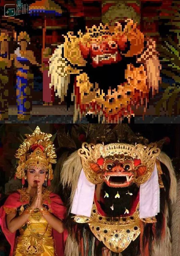 这场景最引人注目的就是画面中央一只类似“舞狮”的东东,这是巴厘岛很有代表性的巴隆舞(Barong),演绎的是正邪对决的故事。巴隆是善神的化身,由双人演出,举手投足如同中国的舞狮。旁边还有两个身穿黎弓舞(Legong)服饰的舞娘正驻足观看比赛。