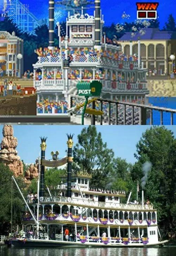 这个所谓的“探险世界”其实就是迪士尼乐园的某个主题乐园了。这只邮轮和迪士尼乐园里的如出一辙。可能SNK为了规避版权使用了“探险世界”这种模糊的说法。