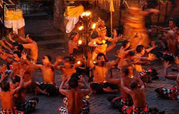 场景最右边有些类似跳大神的同学,这是巴厘岛很有宗教色彩的凯卡克舞(Kecak),凯卡克舞表演时间都在黄昏居多,表演时由一群男性环绕着火炬而坐,一边摇晃着身驱,一边发出宗教式的呼声。名字起源于迷咒舞桑扬(Sanghyang)所发出的“kechak-kechak”的伴唱声音。