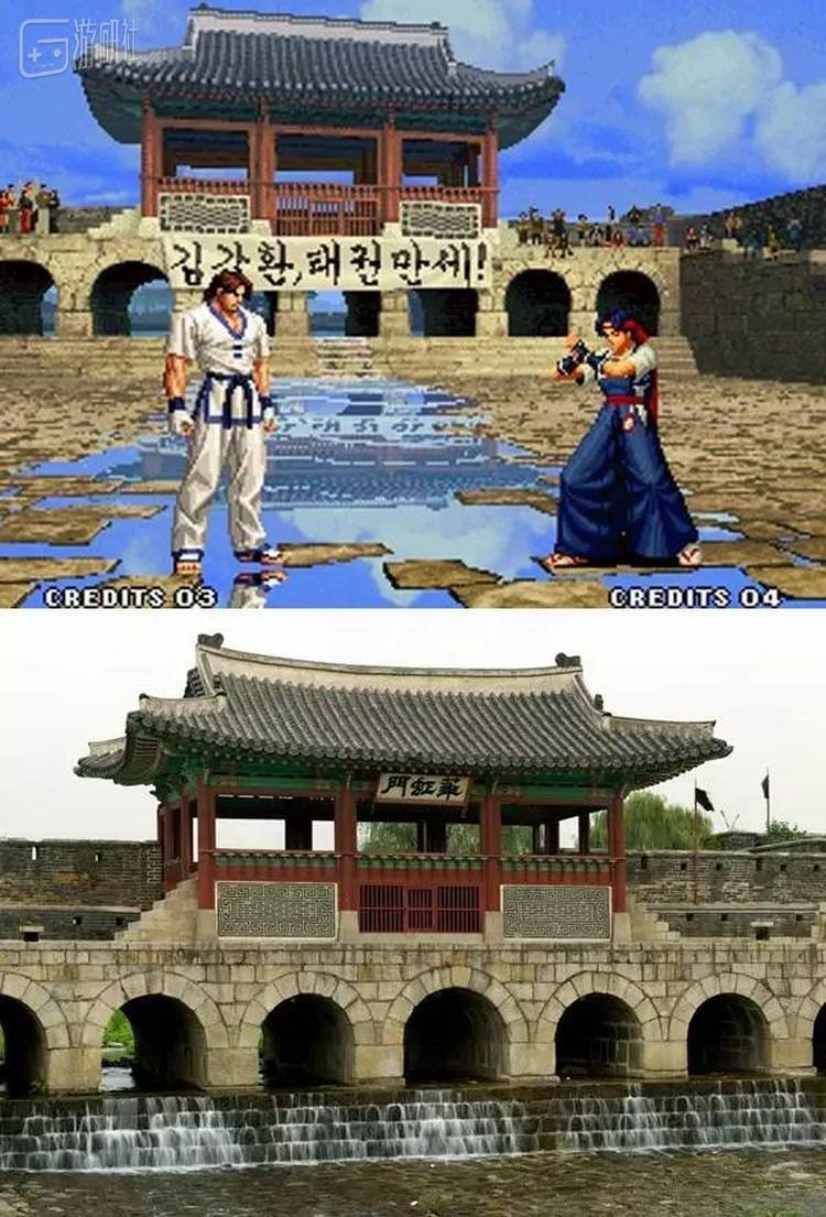 KOF96的韩国背景是水原华虹门城桥,在港漫《拳皇97》也有出现,只是把“虹”字改成“红”。