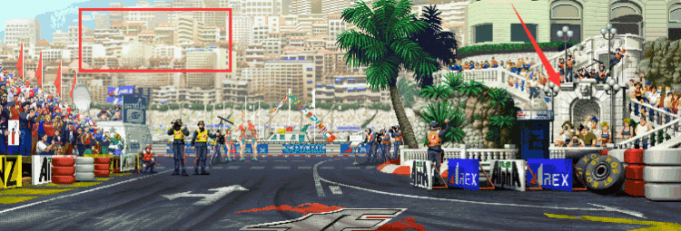 摩纳哥场景画面和色调是97所有场景里看起来最清新的一个,也是八神或蕾奥娜暴走的场景之一,不过在两人对战时是不会随机到这里的。这是F1大赛摩纳哥大奖赛的一个场景。所以在场景里可以看到赛车跑道,赛车轮胎。