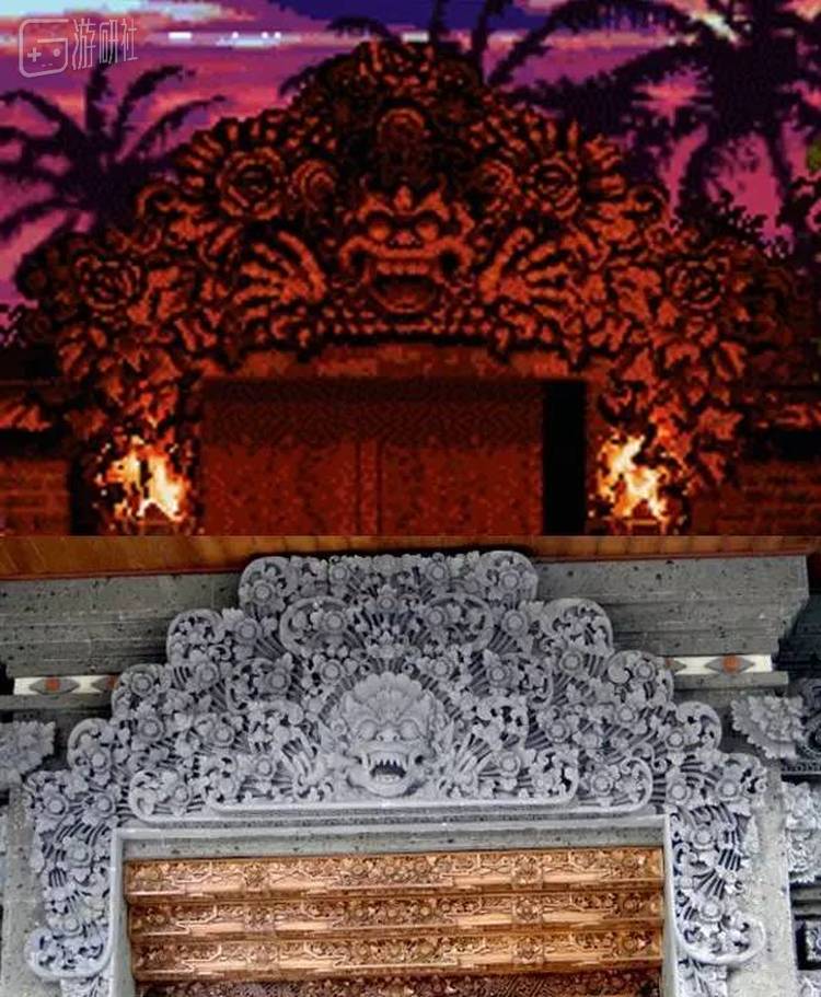 无论是场景还是节奏感极强的bgm,都充满南洋风情。下图这些标箭头的地方,我也找了现实中的对应图。