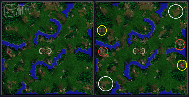 而FloodPlains(洪泛平原)则是增加了四个地精实验室,但都由最高级的红色野怪看守。另外还在四个出生地附近各加入了两组绿色野怪,供玩家初期打野练级。