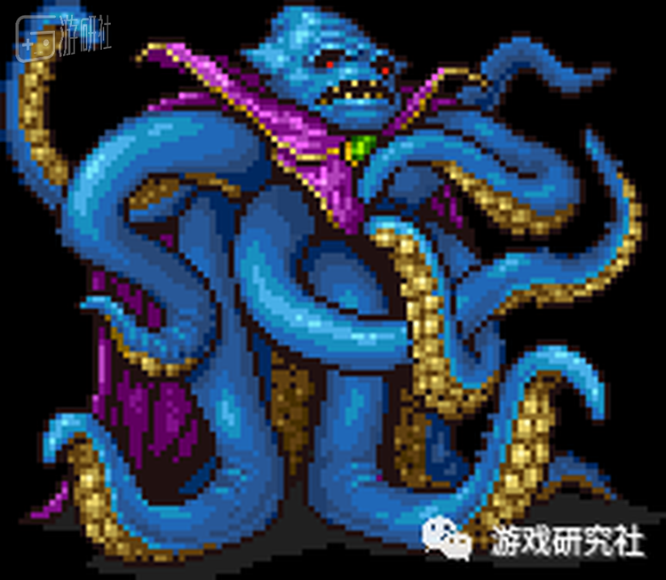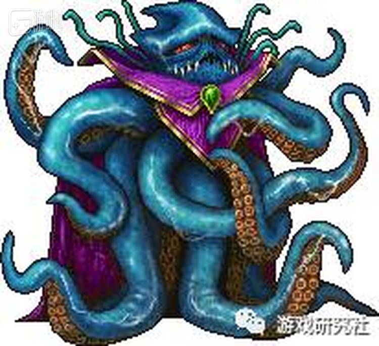 虽然看这个点阵图很难想象它的完整外形,但触手的特征还是被很好地还原了。《最终幻想》经历了好几次复刻,克拉肯的形象也随着每次复刻作品美术设计的变化而发生了一些改变,在GBA版里,它长这样: