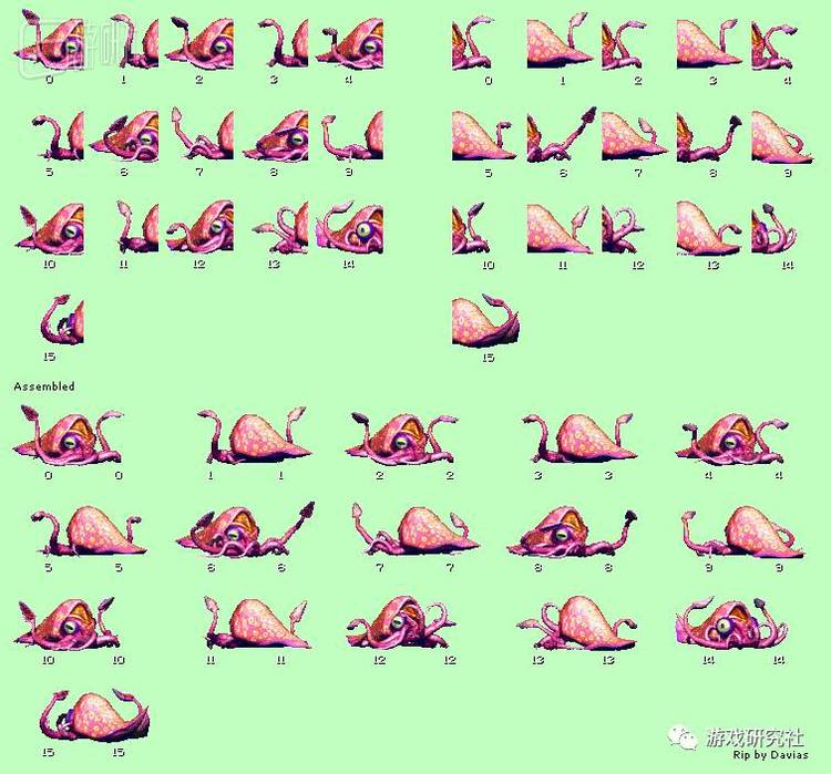 GBA两作《黄金太阳》的特点,是用贴图来表现类似于3D建模的效果,根据下面这张贴图拆分图,你可以更清楚地看到克拉肯的一些外形特征。
