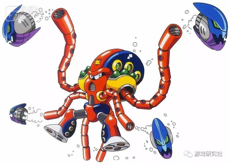 或者说,只要你对洛克人系列有一点认识,那么就应该能猜到,他也是个来给主角送装备的Boss。这个背后长着三支触手、头部呈箭状的角色名叫Squid Adler,很明显,他的原型就是一只鱿鱼。