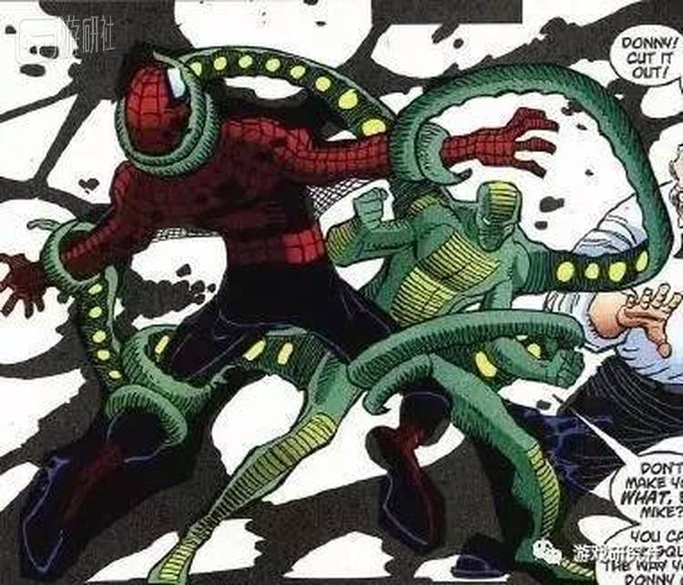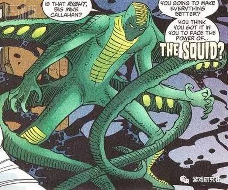 从外表上来看,The Squid的形象和章鱼博士倒是有几分重合,特点都是背后长出来的长长的触手,但The Squid的触手不像章鱼博士的那样在末端长着爪子,而是以密布在触手上的吸盘为特征,比起要用触手完成各种高难度动作的章鱼博士,The Squid的触手通常被用来把人绑起来然后暴揍。