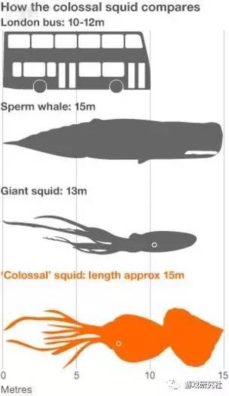 抹香鲸、大王乌贼和大王酸浆鱿的体积对比