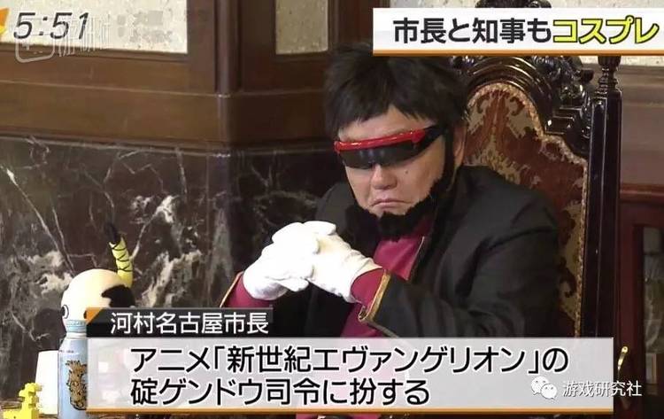 河村装扮的是《新世纪福音战士》里的司令碇源堂,说起来这位市长是个官僚痞子,名声可不太好,曾经否认过南京大屠杀,还想建立名古屋共和国,装起来还算有模有样,挺着肚子瘫坐的时候,气势就下去了。
