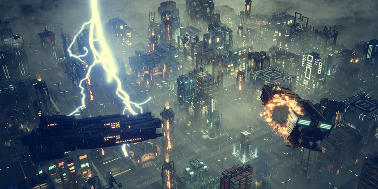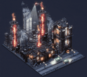 《泰坦工业》中的场景采用华人作者gltracy开发的开源像素建模软件Magica Voxel搭建,虽然是像素风,但却十分的精细,细节也处理得非常的到位,可以看出这个城市灯火通明,车水马龙,充满活力: