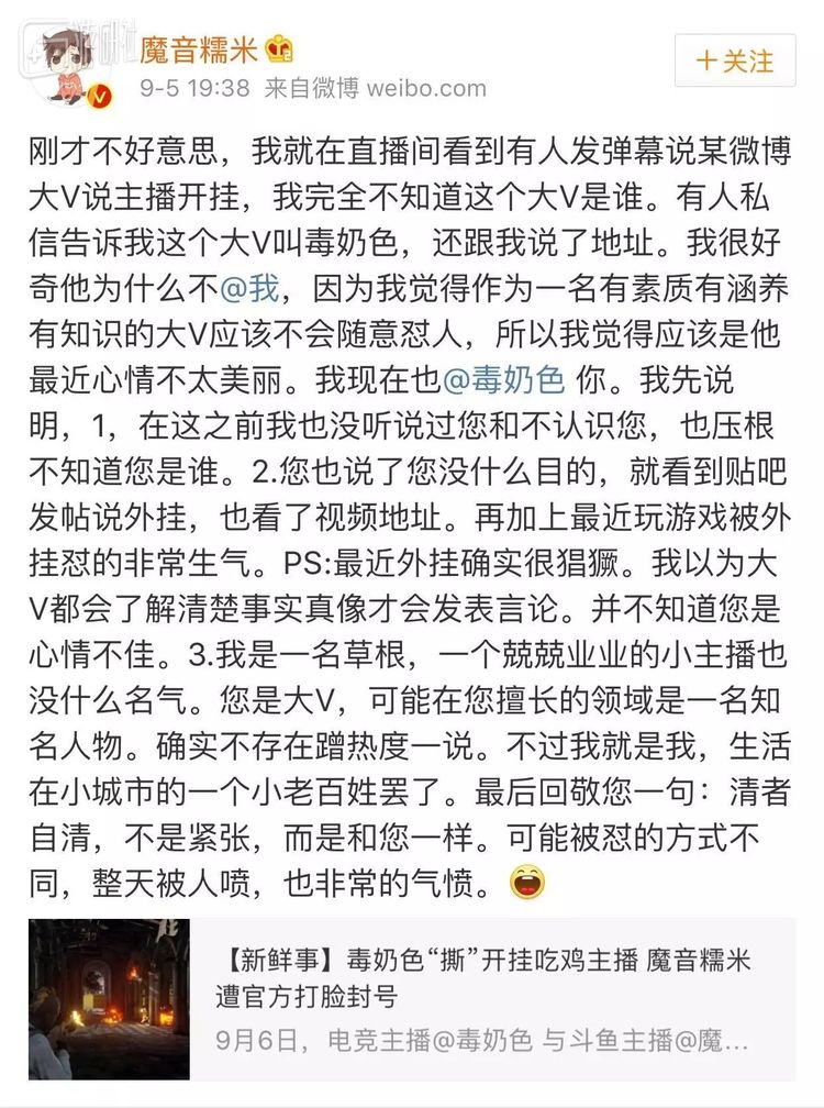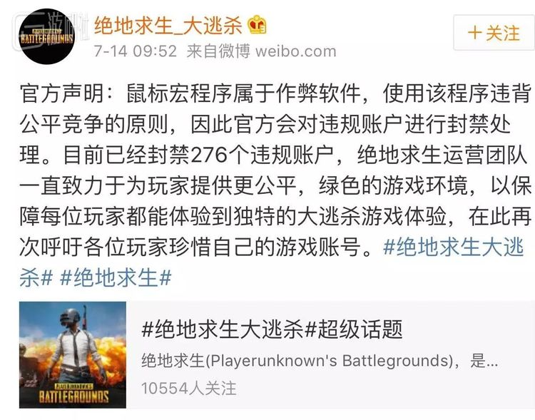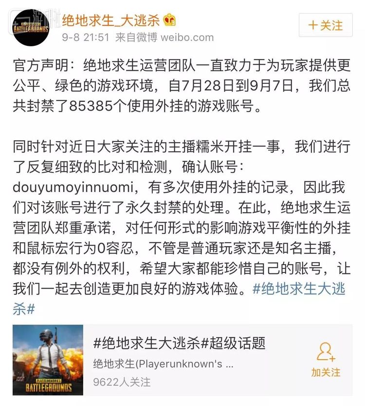 但是在周五晚上,就在吃瓜群众仍在对此事件进行激烈的讨论的时候,《绝地求生:大逃杀》的官方微博出手了,在微博公告表示“魔音糯米”本人之前在微博承认的账号使用了外挂,并对其进行了永久封禁。