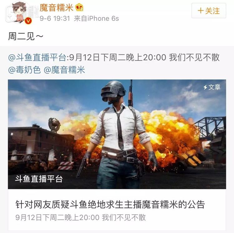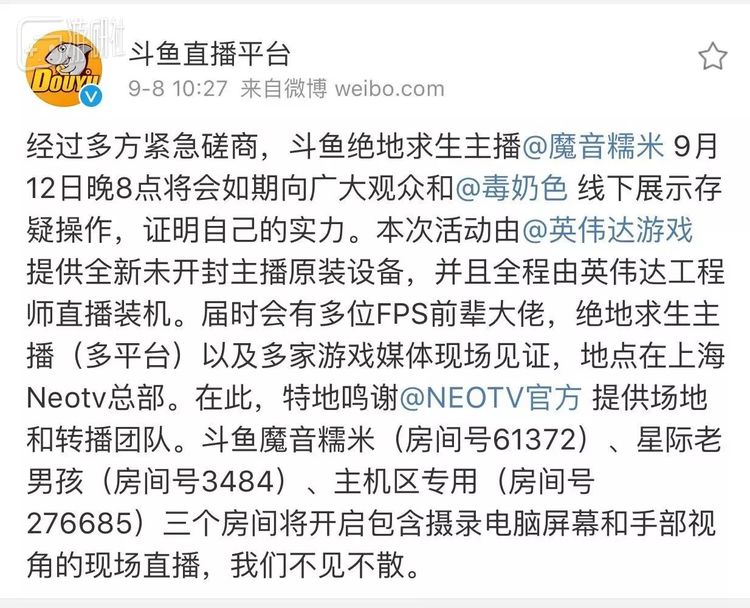 之后斗鱼在发表长文章,对此次直播进行了预告,事件也改到了周二晚上。