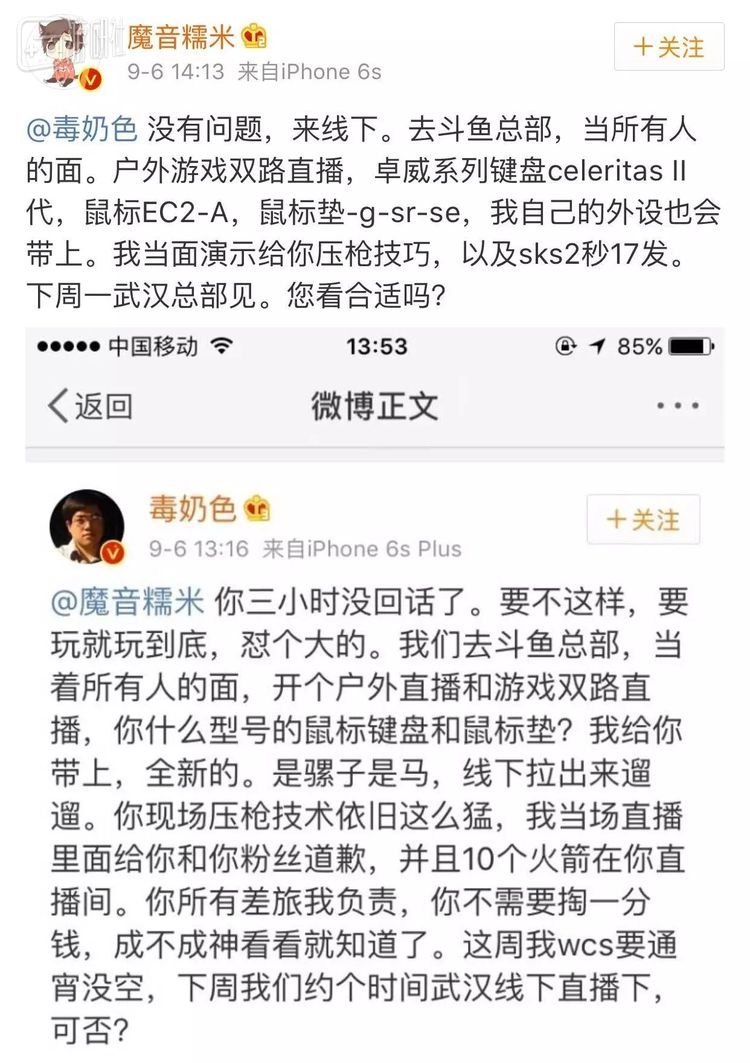 但是第二天早上10点,一众在直播间等待的吃瓜群众却没有等来魔音糯米本人,黄旭东色在等待了三个小时之后,再次在微博上对其进行声讨。随后,魔音糯米以长微博回应,称愿意在斗鱼总部以直播的形式演示自己的压枪技巧和sks2秒17发的操作。