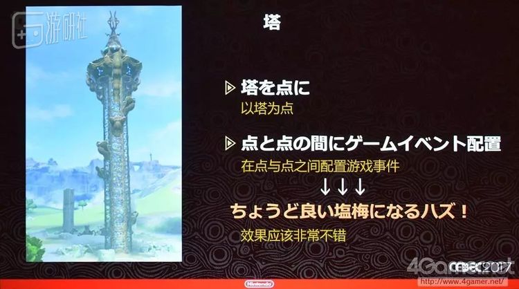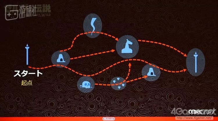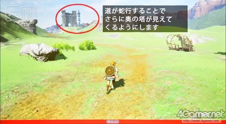对《荒野之息》来说,玩家在游戏世界中比较容易获得的情报元素是“塔”,将这些塔作为引导点分布在世界各处就等于为玩家提供了“动机”。并且当玩家在塔与塔之间移动的时候,还可以顺势在路途中间加入一些剧情事件。