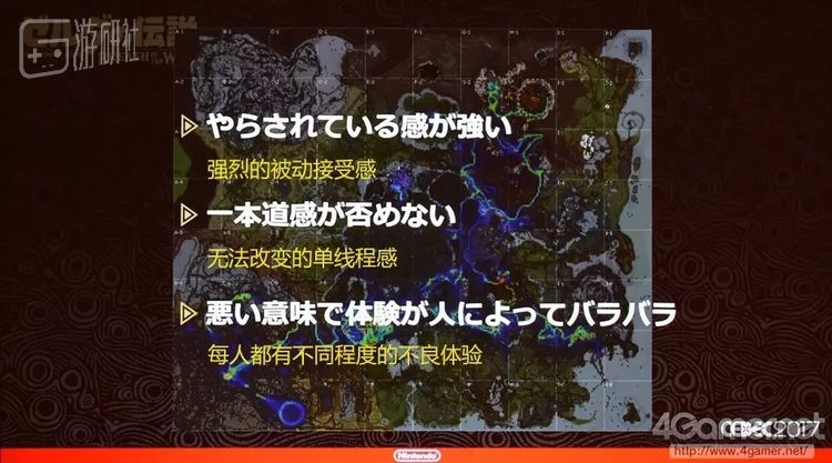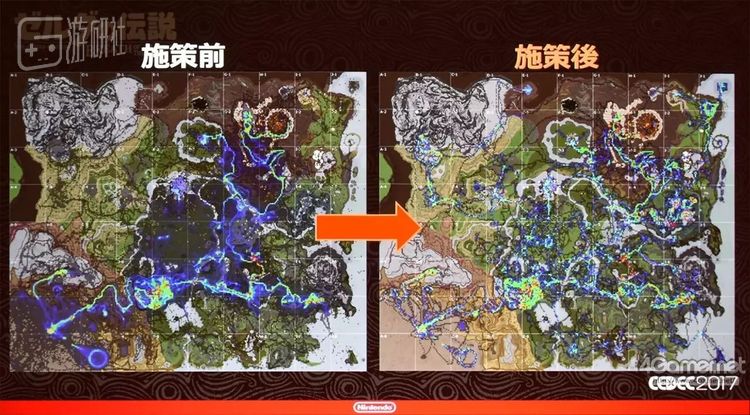 首先登场制作人藤林秀麿一上来就给大家放出了两张基于《塞尔达传说:荒野之息》(以下简称《荒野之息》)地图的热度图。