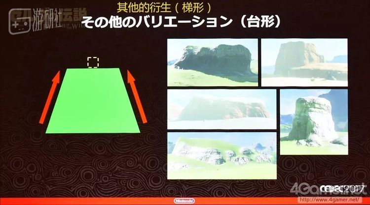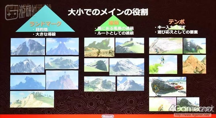 他说在《荒野之息》中,地形的起伏和自然物的配置,基本上都是以三角形为基础设计的。比如,玩家眼前现在出现了一座山或者丘陵,那应该是攀登过去还是迂回过去,路线就会产生分歧,如果再夸张一点说,玩家在探索中的决策就受到了考验。