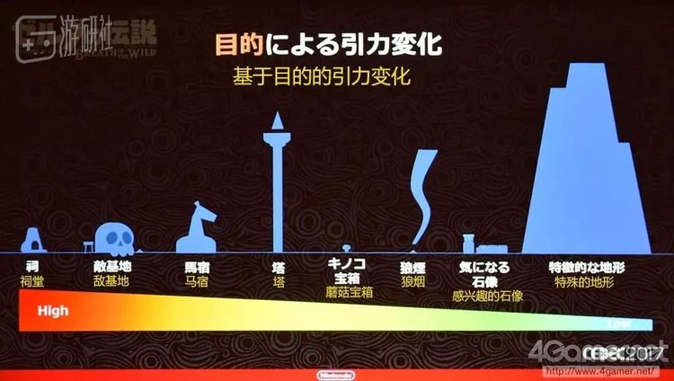 从很远的地方就能看得到的特殊地形,总会有一种“好像有什么东西在那”的感觉,让人探索欲大增,这就算是一个很强的大的引力。一开始提到的“塔”就算是一种很远的地方就可以看到的设施,作为在广大游戏世界中最容易获得的情报的地方,那里应该会吸引着许多喜欢探索的玩家前往吧。