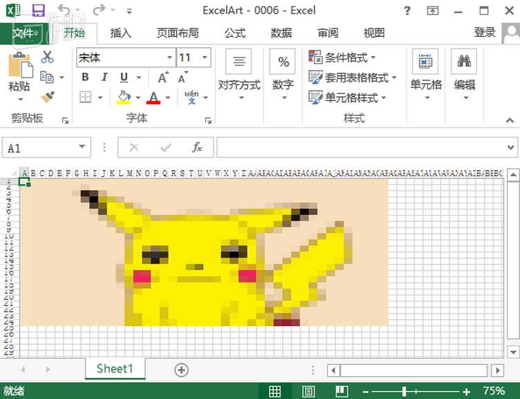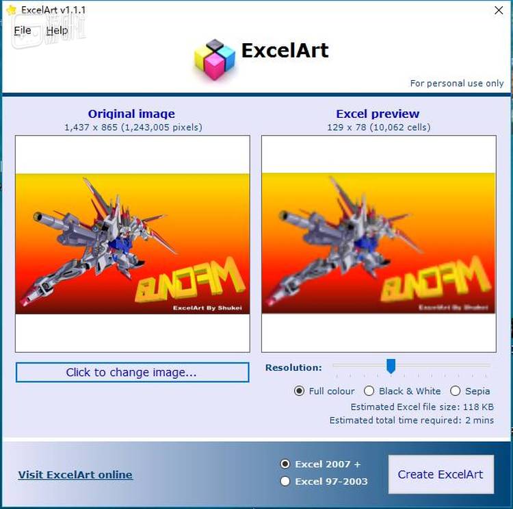 除此之外,我还发现了一个专门的Excel像素图生成工具:ExcelArt。可以把任意的图片转化成Excel中的像素图。