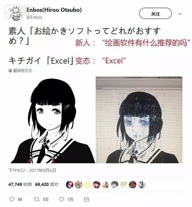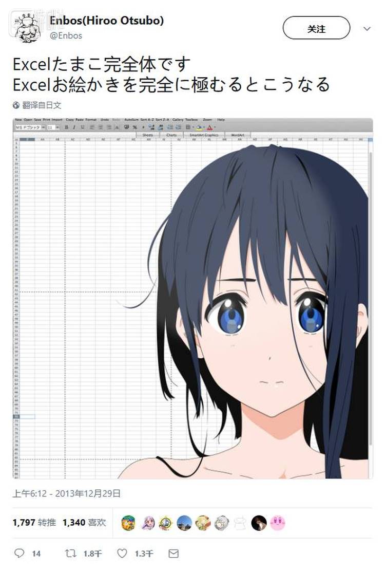 熟练掌握了这个“黑科技”后,Enbos就开始时不时的画一些自己喜欢角色的Excel插图。