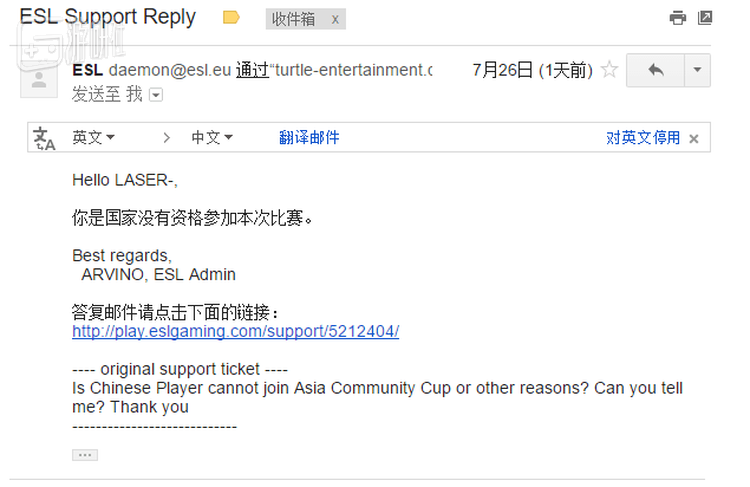 翻查细则后,黑鹰发现大陆地区的确不在ESL的服务范围内。这对于报名参赛的玩家的士气造成了沉重的打击,一时间谣言四起,甚至还有人认为中菲关系紧张导致了菲律宾管理员Arvino的恶劣态度。很少有人意识到,由于中国特殊的审批与签证政策,海外的电竞承办商往往不愿意承担额外风险与潜在成本,让未过审游戏的国内玩家参与到国际赛事中。