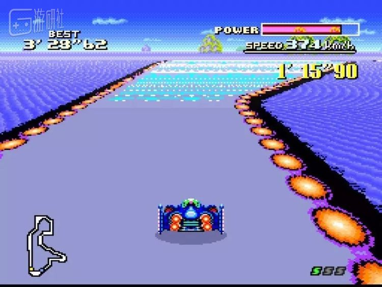 作为SFC首发游戏,《F-ZERO》承载着展现硬件性能的重要任务。任天堂在SFC中加入了一种被称为“Mode 7”的画面机能。其特点是可以将图层进行缩放和旋转,从而营造出画面的纵深感。作为两款首发游戏的其中之一,《F-ZERO》希望能通过对Mode 7的运用展现SFC的强大性能。游戏中的赛车基本能全程保持在400Km/h以上的速度,赛道图层的高速缩放也确实表现出了这种速度感。