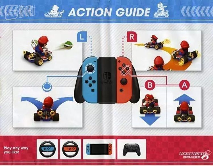 下面这张图是NS版《马里奥赛车8豪华版》的包装盒内页,也是这款游戏的操作说明。在2017年,这款游戏可能是操作方式最简单的大作之一。
