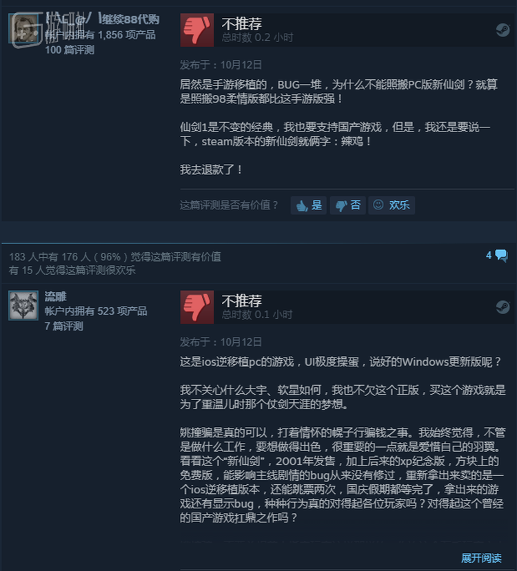 按道理说,能重温童年回忆一般来说都是好事,加入了个情怀梗也可以算作加分项,但目前“新仙剑”在Steam平台的评价却收获了差评一片。此前多数针对炒冷饭的争议多来自于售价昂贵、吃相难看,而新仙剑玩家不满的原因则主要在于逆移植:玩家在入手游戏后发现Steam版是基于iOS版制作的,UI还保留着手游的痕迹,操作不便,并且bug频出。
