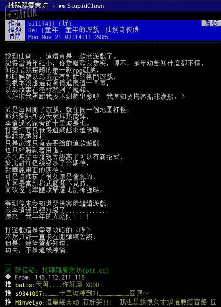 2005年,StupidClown(笨版)上有网友发帖回忆仙剑初代,一位名叫bill7437的跟帖表示,自己在小时候因为不知道可以走出最初的渔村,就在十里坡打怪练级砍了半年,甚至练出了李逍遥的终极技能“剑神”,直到71级才经人指点,继续剧情。