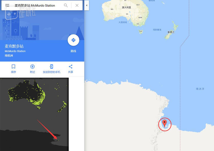 另一个来自南极大陆的热点位于新西兰南部,国际日期变更线附近。Google地图显示,这里是罗斯岛的美国麦克默多科考站——它是美国最大的南极研究站。