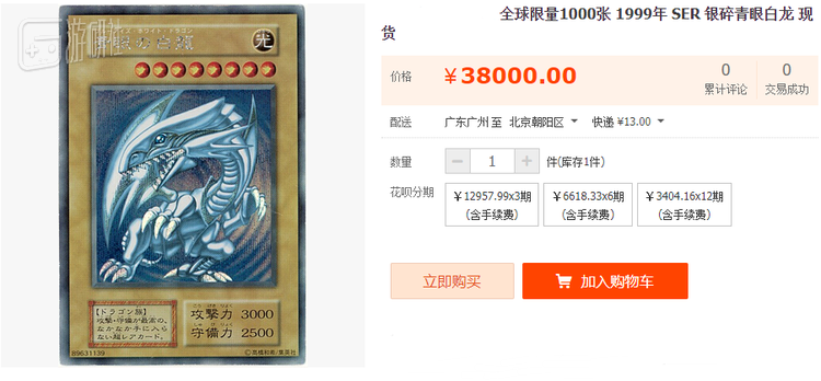 这四张珍贵的“青眼白龙”卡牌是在1999年少年Jump 祭典现场销售的限量版,数量只有1000张。在日拍网站上,这张卡片的单价已经达到了39万日元(约合人民币2.3万元)。