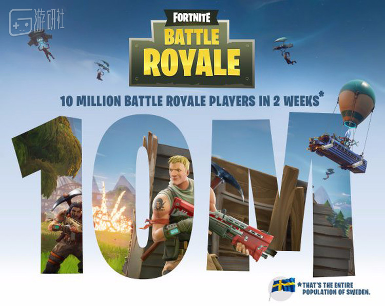 10月4日,《堡垒之夜》大逃杀模式玩家过700万,同时在线人数峰值达52.5万人;10月11日,大逃杀模式上线2周后,玩过该模式玩家达1000万,与瑞典总人口数相当: