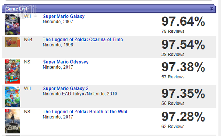 虽然从排名来看,第三名和第一名的区别蛮大的,但其实《奥德赛》和目前评价最高的《超级马力欧:银河》之间也只相差0.26%,之所以有这个成绩,是因为目前有50多个媒体给《奥德赛》打了满分。