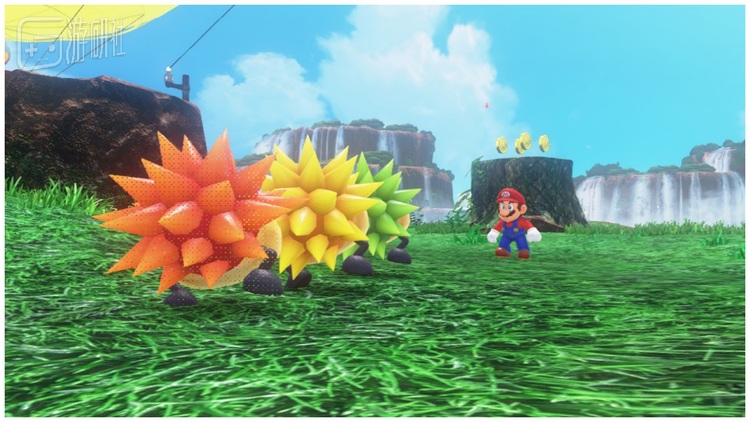在“通过控制主线任务难度来转移玩家注意力”这一点上,通过3DS上的《超级马力欧 3D 乐园》和WiiU《 3D 世界》这两款闯关类马力欧游戏的积累,任天堂在《奥德赛》里将难度控制在了一个合理的水平。有时候你觉得自己只是在通过跑跳攀爬一座山、柱子,或者高耸的建筑物,但山的作用不仅仅是高而已。在瀑布国有一个场景,是马力欧进入水管,变成FC版马力欧,通过在平面的墙壁上行走到达山顶,也就是说垂直于地面的墙壁变成了一个卷轴。回到3D环境之后我们就会发现,3D的山体也是将自己作为卷轴,构成了一种“2.5D”环境,既可以提升跳跃过程中的安全性,也可以通过视觉遮蔽降低场景的复杂度。