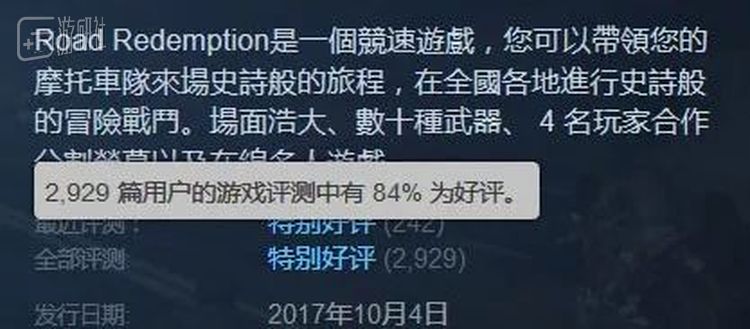截至目前,《公路救赎》在Steam上共获得近3000个评价,总体评价为“特别好评”,好评率84%。