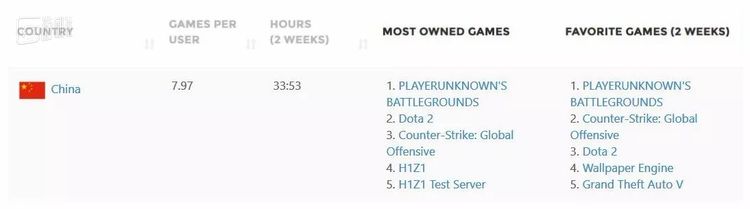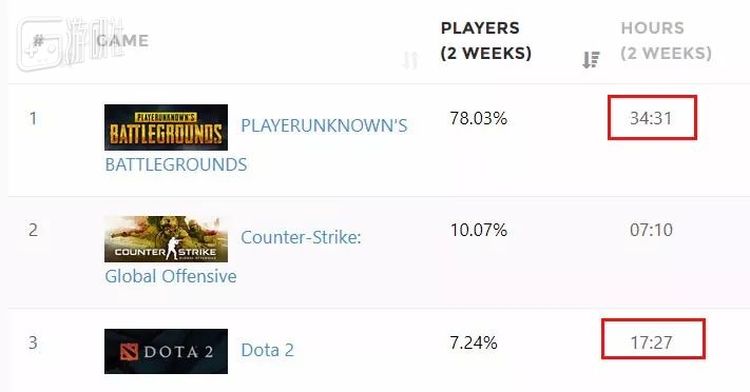 最近两周,中国玩家在《绝地求生》上花的平均游戏时间是34个小时,是第二名《Dota2》游戏时间的两倍。