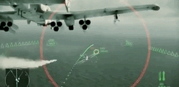 上图是《皇牌空战:突击地平线》中A-10的攻击演示画面,虽然它所发射的是制导武器,但必须先用机头对准目标完成锁定,攻击窗口也只有短短几秒时间。一旦错失,就必须在调头之后再来一轮俯冲了。