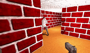 这个游戏不但能在迷宫中自由移动,还增加了跳跃、射击等特色元素。射出来的子弹击中墙壁后,默认的红砖墙会变成部分透明的花纹,可以隐约看清后方的情景。更重要的是,在这个游戏中过关后终于可以进入真正意义上的“下一关”,虽然之后的迷宫贴图依然是新版三维迷宫的内置贴图,但是论完成度上,《屏保诡计》算得上是各种土制三维迷宫游戏的集大成者了。