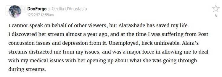 从2014年至今,Alara的twitch频道已有13000余个订阅,她拥有了一大批忠实粉丝。除了体验老游戏的快乐,Alara还会在直播中分享自己的经历,讲述自己如何走出阴影。