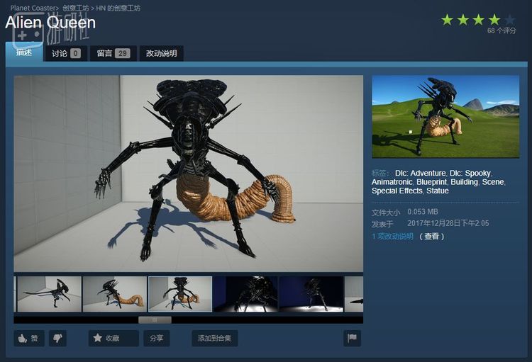 目前“频尿”兄贵还没放出异形的主题,倒是先把过程中做好的女王物件分享了出来,有意者可去Steam创意工坊下载来用一下。