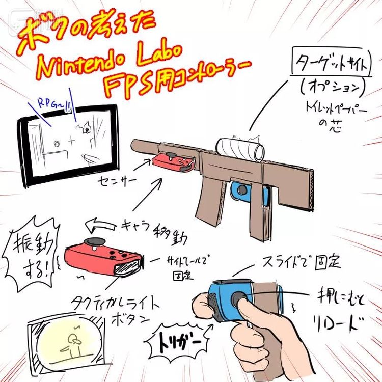 设计中充分利用到了Joy-Con的IR摄像头和振动机能,因为是自制,瞄准镜直接采用卫生纸卷芯,可说是废物利用,省钱环保。
