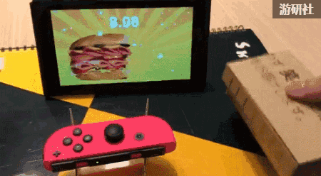 下面这位想了个办法,有纸盒子改进了下Joy-Con的操作方式,用来玩《1-2-Switch》里的吃汉堡小游戏还颇见效果。