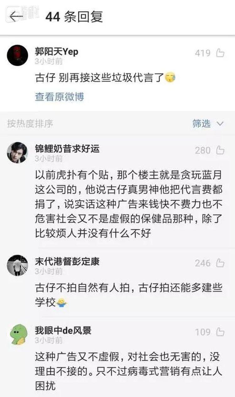 在这条微博的评论区里,有人试图劝说古天乐不要再接这样的广告,很快就引来了众多粉丝的回复: